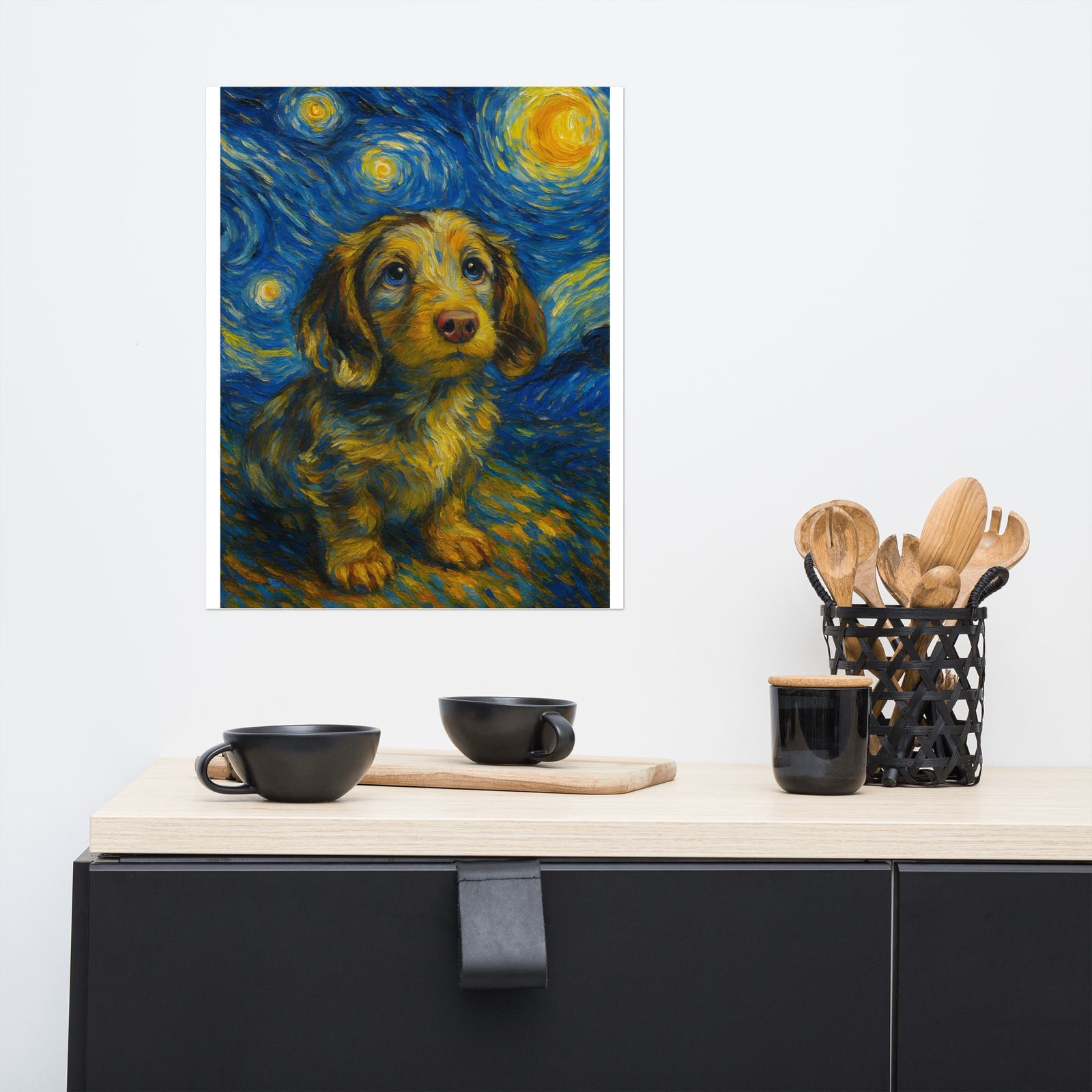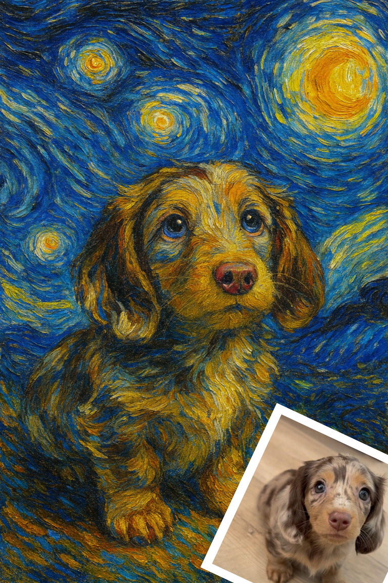 We use a photo of your pet and turn it into a work of art. This design is based on Van Gogh’s Starry Night. Get a custom piece of art, based on your pet photos. We can create art for any pet – dog, cat, rabbit, bird – any animal.