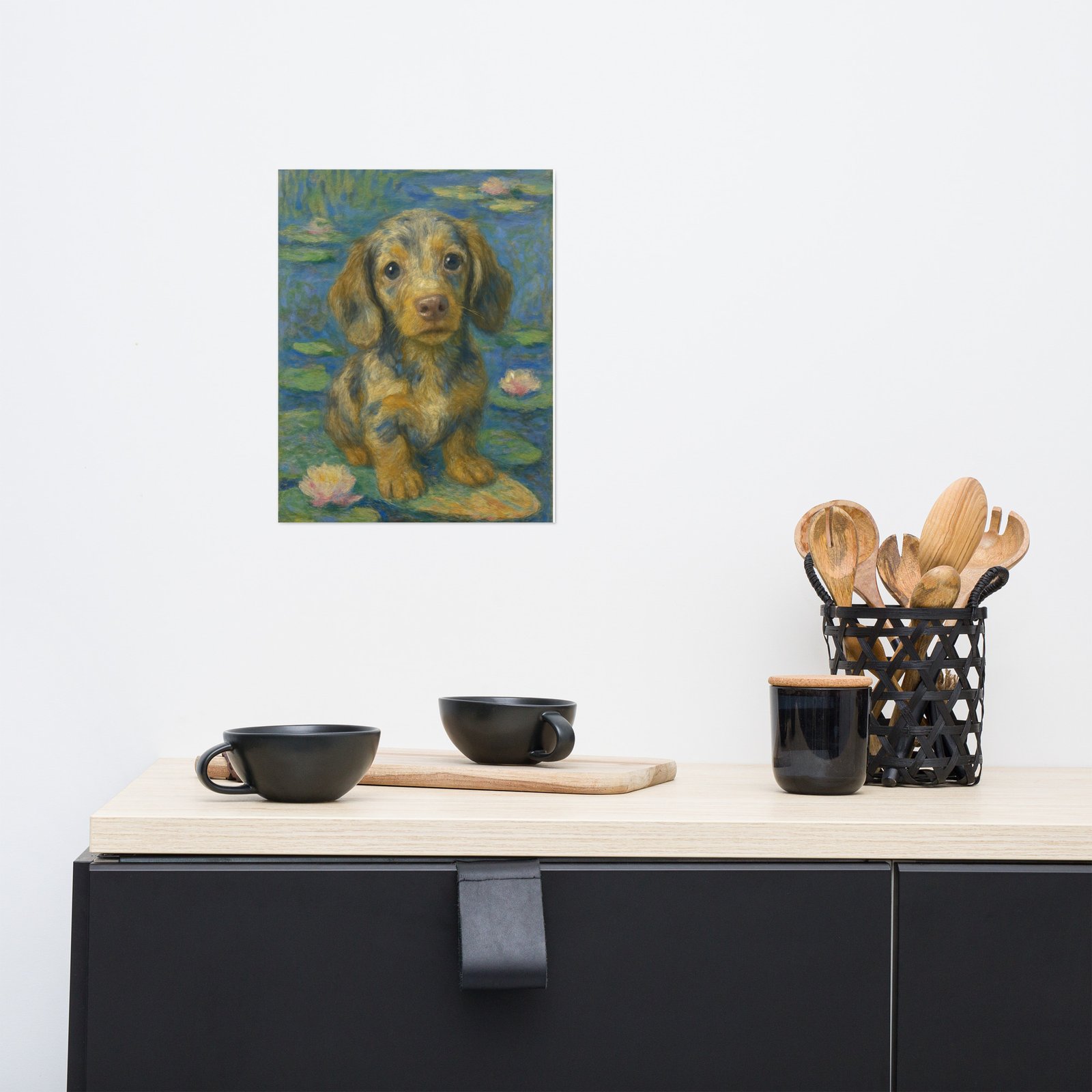 Custom pet portrait in the style of Monet’s “Water Lilies” printed on high-quality, thick matte poster paper.